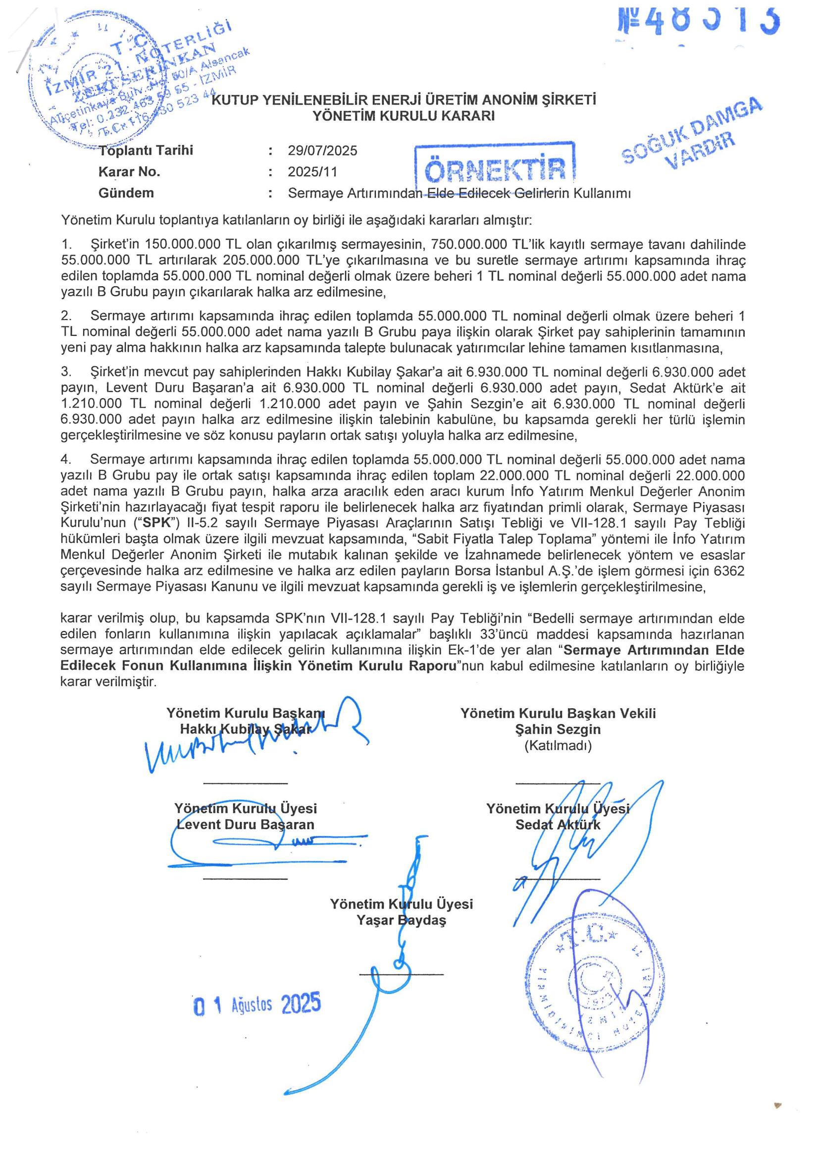 Yönetim kurulu üyelerinin adları ve soyadları – Hakkı Kubilay ŞAKAR – Şahin SEZGİN – Levent Duru BAŞARAN – Sedat AKTÜRK – Yşar BAYDAŞ